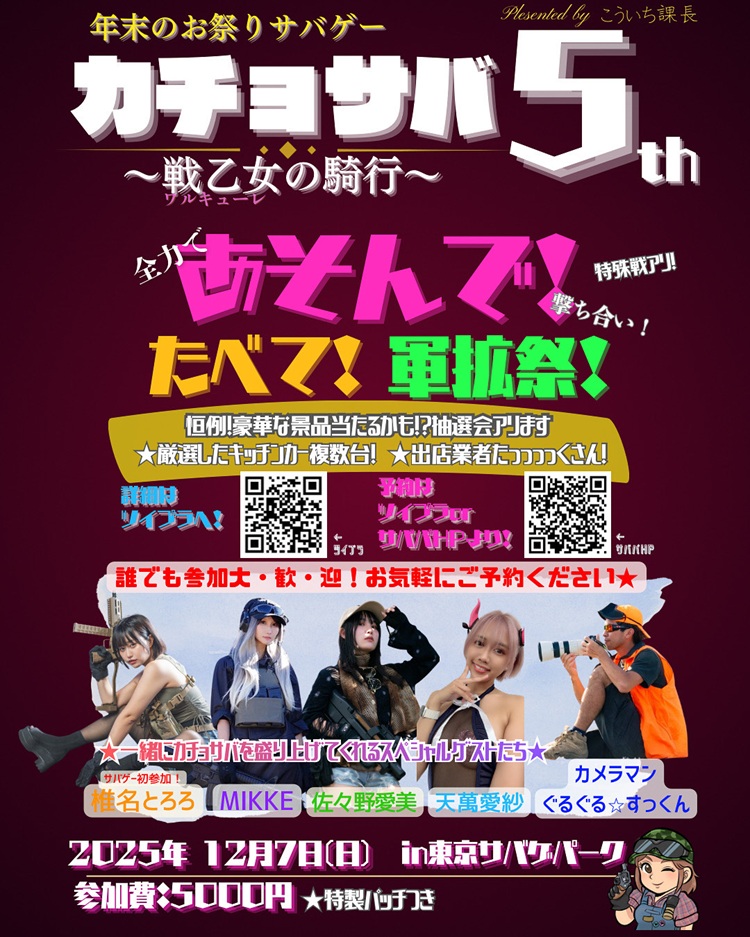 | 【カチョサバとは】 こういち課長個人主催のみんなでワイワイ楽しく遊ぶエンジョイ系サバゲーイベントです! 今回の参加がサバゲー初めてという方でも大歓迎! しっかり初心者講習も受けられるので安心して一日遊べます♪ 装備のレンタルもできますし、当日はエアガンを販売する業者さんもくるのでハマったら当日そのまま相棒をお迎えできちゃいます カチョサバ初参加の方も!初心者さんも!経験者さんも!ベテランさんも!!みんな仲良くサバゲーしましょう! 本当に誰でも参加OKです! 参加資格は当日めいっぱい楽しむぞっていう気持ちだけ 開催時期的にぜひ忘年会としてご友人やお仲間との参加いかがでしょうか? カチョサバの魅力はサバゲーだけでなくお買い物やご飯まで全力で楽しめちゃうところ!! お買い物だけ、ランチだけしたい方も大歓迎です♪ 選りすぐりの業者さん達を存分にお楽しみください! セーフティでも暇な時間なんてないぞ~! おこづかいはお年玉を前借り&お財布はゆるゆるでお越しください さらに!! 当日はこういち課長の大好きなユーロビート系音楽が会場中に流れる予定です♪ サバゲーするもよし!パラパラするも良し! →前回までのカチョサバの様子が気になる方は #カチョサバ #カチョサバ4th などでXで検索してみてください♪当日の楽しい雰囲気が分かります カチョサバスタッフ一同皆様のご参加を 心よりお待ちしております | |