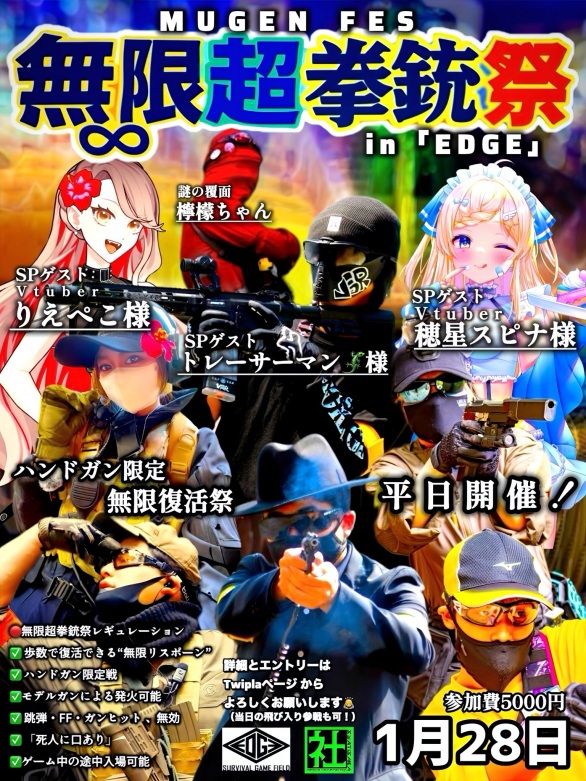 | 無限超拳銃祭 in EDGE 「無限拳銃祭」と「無限リボルバー祭」を融合したハンドガン特化イベントを開催! EDGEフィールドで1月28日、無限式ルールで楽しもう! 〇開催概要 開催日:2026年1月28日(火) 場所:サバゲーEDGE(茨城県牛久市) 住所:茨城県牛久市上太田町2861-6 フィールド公式HP 送迎は公式HPより予約をお願いします。 参加費:5,000円(現金払い) お昼休憩:フィールド特製のお弁当あり 〇エントリー方法 各ツイプラページまたは申し込みフォームからエントリーをお願いします。 参加申し込みフォーム お問い合わせ:無限復活祭運営 Ryo(X: @hayatems08) | |
