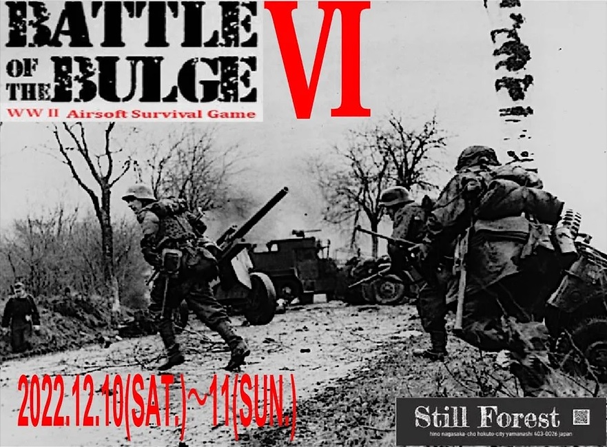 | 参加受付開始!! 11月1日~12月7日迄 参加軍 「バルジ戦」に参加した各国軍 ・ドイツ軍・アメリカ軍・イギリス軍 (レジスタンス等の正規参戦国軍では無い装備は参加出来ません) 申込はHP CONTACTより ・氏名 ・参加軍 ・連絡先 ・参加日(1日参加・両日参加) ・使用銃 を明記 参加費 両日参加 6000円 1日参加 3000円 入場・退場 入場10日 10:00(早朝より駐車場は入場可能) 退場11日 16:00 (9日入場キャンプ可能。前日のキャンプは 別途お一人1000円のキャンプ料金発生) | |