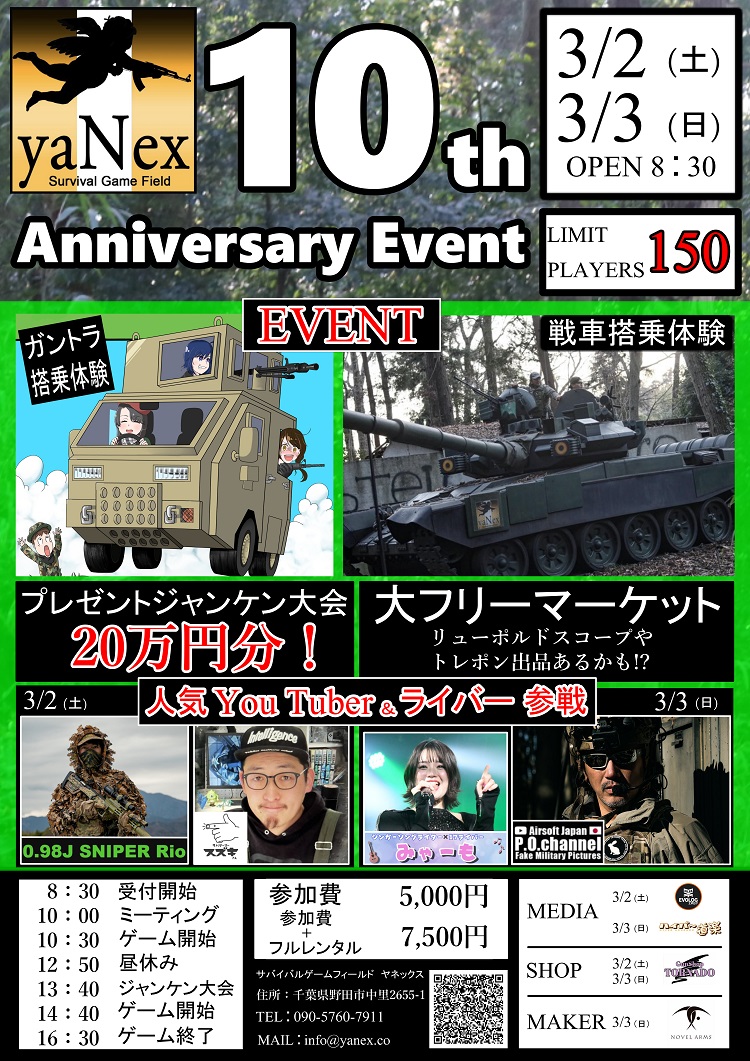 | 皆様ありがとうございます。 ヤネックスはついに10周年を迎えることが出来ました。 2023年11月24日、ヤネックスは10周年を迎える事が出来ました。 紆余曲折がありながらも、こうして10周年を迎える事が出来たのはお客様の皆様、地域の皆様、ご支援を頂いているショップやメディアの皆様、そしてスタッフのお陰です。 本当にありがとうございます。 この場をお借りして感謝申し上げます。 さて、前回の2018年の5周年イベントから5年振りの10周年イベントを開催致します。 本当は昨年11月にやる予定でしたが10周年イベントの目玉である軽トラを魔改造した装甲車「ガントラック」の完成が遅れてしまった為、2024年3月2日(土)と3日(日)に10周年イベントになってしまいました(笑) | |
