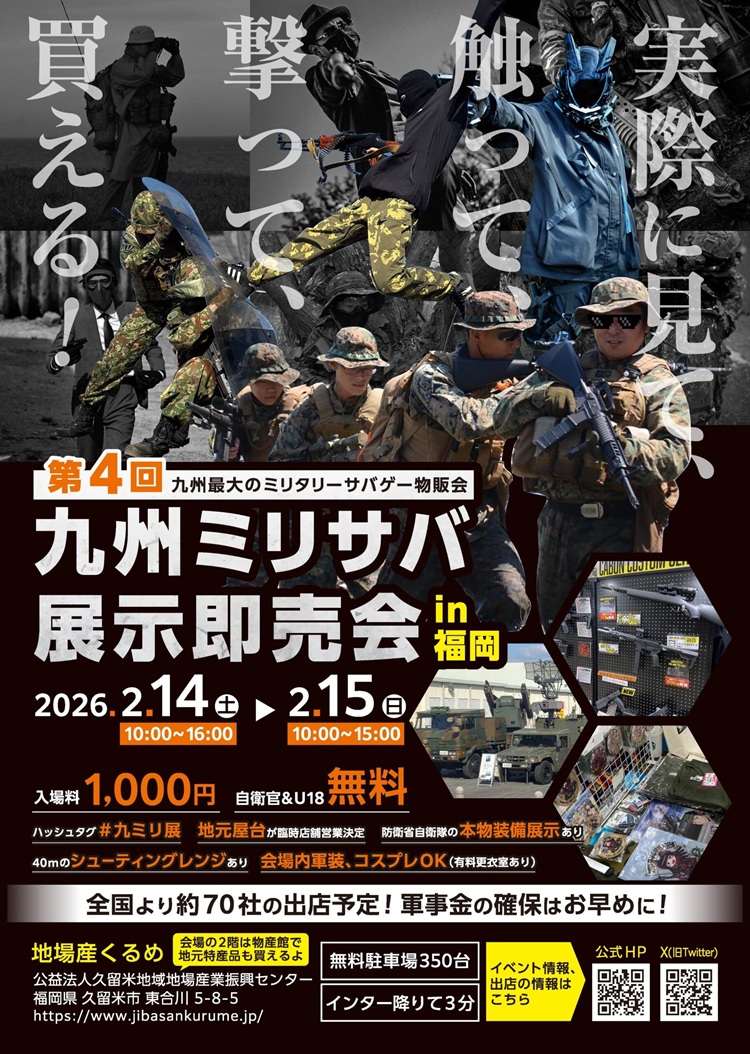 | 日時 開催日 :2026/2/14(土)~2/15(日) 開催時間:10:00 ~ 15:00 入場料 :1,000円 ※自衛官および18歳未満は無料 シューティングレンジあり 会場内軍装、コスプレOK 会場 会場名:地場産くるめ(公益法人 久留米地域地場産業振興センター) 住所:福岡県久留米市東合川5-8-5 公式サイト:https://www.jibasankurume.jp/ | |