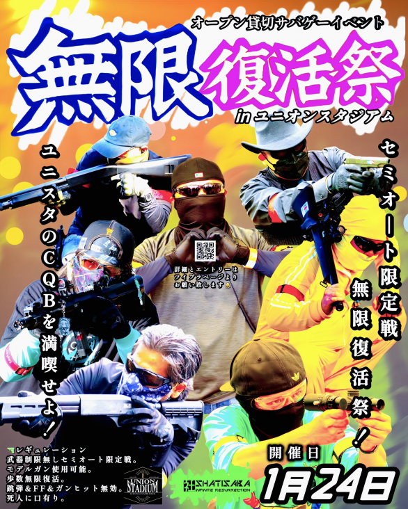 | イベント名 無限復活祭 in ユニオンスタジアム 〇開催日 2026年 1月24日(土) 〇会場 ユニオンスタジアム 住所:千葉県印西市平賀 2843-1 公式HP:https://stadium-union.com 〇参加費 一律 5,000円 (現金でのお支払いをお願いします) 〇エントリー方法 エントリーは 各ツイプラページ または 参加申し込みフォーム にて受け付けています。 参加申し込みフォームをご利用の方は、 「開催日・イベント名・参加人数」 を記載のうえご連絡ください。 〇エントリー・お問い合わせ先 無限復活祭運営 Ryo @hayatems08 参加申し込みフォーム: https://forms.gle/VZLJqXXbeoFVcS6Z6 〇スケジュール(例) 08:30 開門・受付・弾速チェック 10:10 開会式 10:20 ゲーム開始 12:00 お昼 13:00 午後ゲーム 16:30 閉会式 17:00 完全撤収 〇レギュレーション(無限式) 開催フィールド「ユニオンスタジアム」様のレギュレーションに上書きされる無限式ルールです。 (初速・使用BB弾の指定はフィールドレギュレーションを厳守してください) 〇本イベントの射撃方式:セミオート限定戦 〇無限式の特徴 歩数復活(無限リスポーン) 跳弾無効 FF(フレンドリーファイア)無効 ガンヒット無効 手に持っている装備品は判定なし(悪用禁止) 写真撮影中は無敵(安全最優先) 死亡中の会話OK ゲーム中の出入り自由(スタート地点から扱い) BBローダー・BB弾の袋はフィールド内へ持ち込み可能 〇近接武器について 持ち込みは可能 人に直接当てる行為は禁止 物へ直接当てる行為も禁止(銃・装備・障害物含む) ポージング・演出のみ可 | |